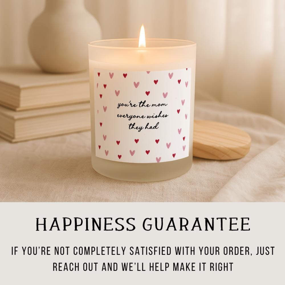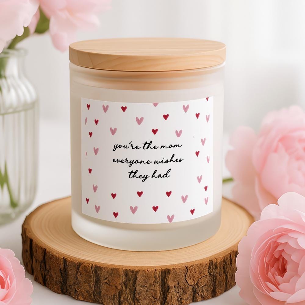 Surprise your incredible mother with this 'You're The Mom Everyone Wishes They Had' scented candle, a perfect Mother's Day Gift for Mom or a thoughtful birthday present. This charming candle, featuring a heartfelt message and delicate hearts, embodies a cozy and appreciative aesthetic. It's designed for the amazing moms who deserve all the love, making it an ideal gift from a daughter or son to show gratitude and affection.