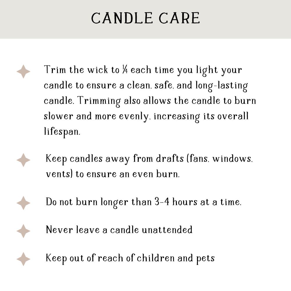 Each of our candles is hand-poured in Spokane, WA and are crafted using a natural soy wax blend, high-quality phthalate-free fragrances enriched with essential oils, and clean-burning cotton wicks. The soy wax offers an eco-friendly alternative to paraffin, ensuring an even burn and a strong bond with our non-toxic scents for a long-lasting, luxurious aroma. Every candle is carefully boxed in a white branded package before being prepared for shipment.