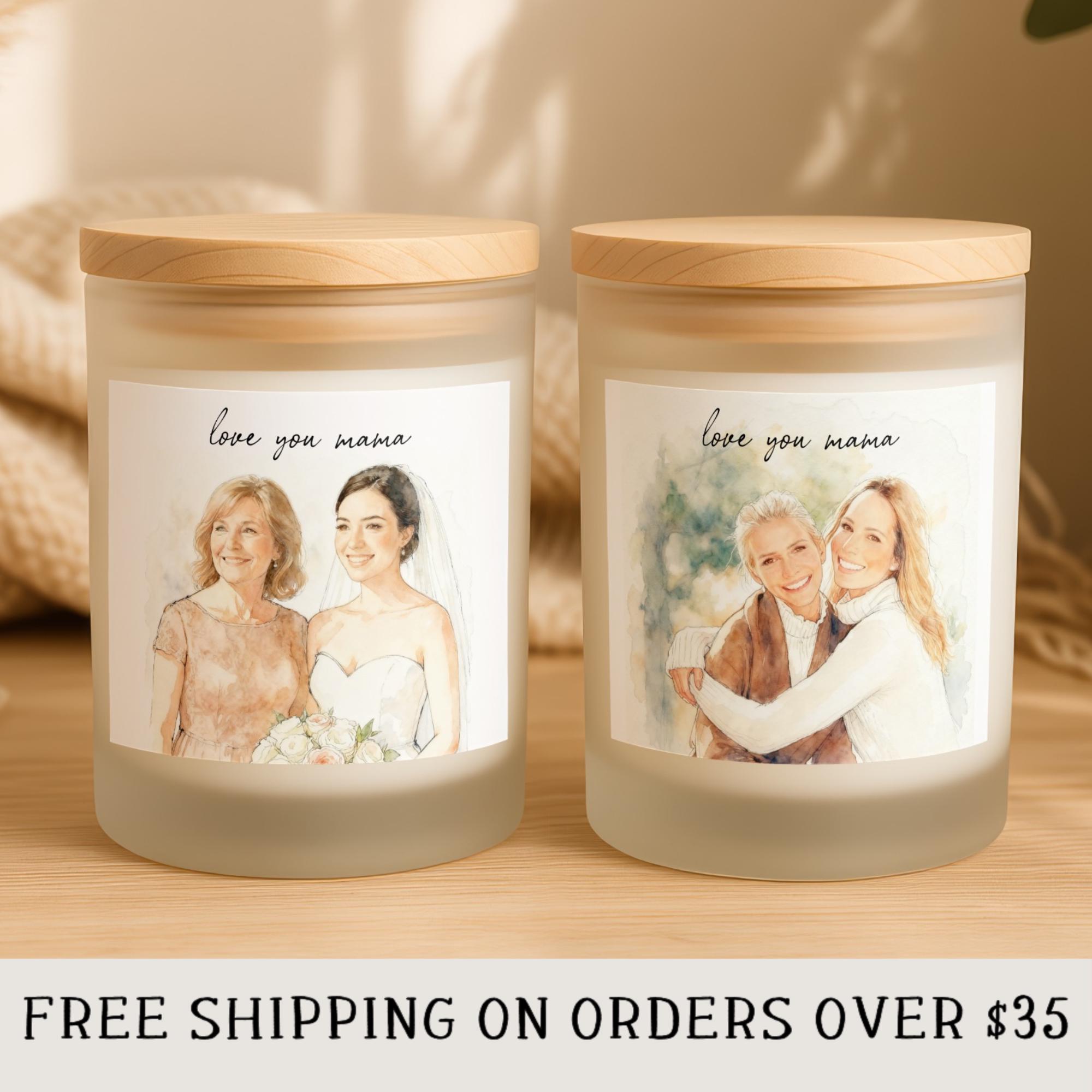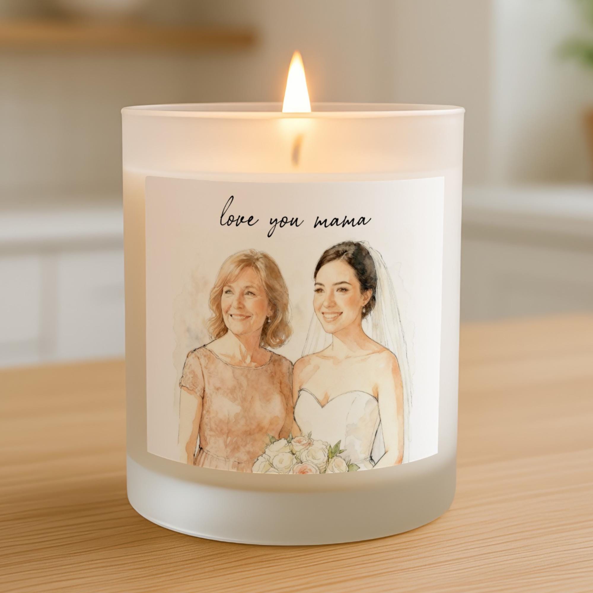 Celebrate cherished moments with our personalized Mother of the Bride Scented Candle, featuring your custom photo transformed with our artistic style. This unique custom candle makes an unforgettable gift. It's the perfect heartfelt present for a bride to give her mom, or a thoughtful gift from the daughter to her mother. Ideal for Mother's Day, birthday, or as a sentimental keepsake, this elegant scented candle adds a personal touch to any home decor, celebrating an unbreakable bond.