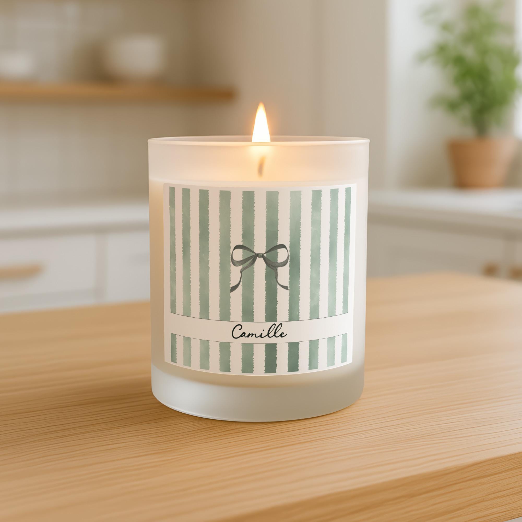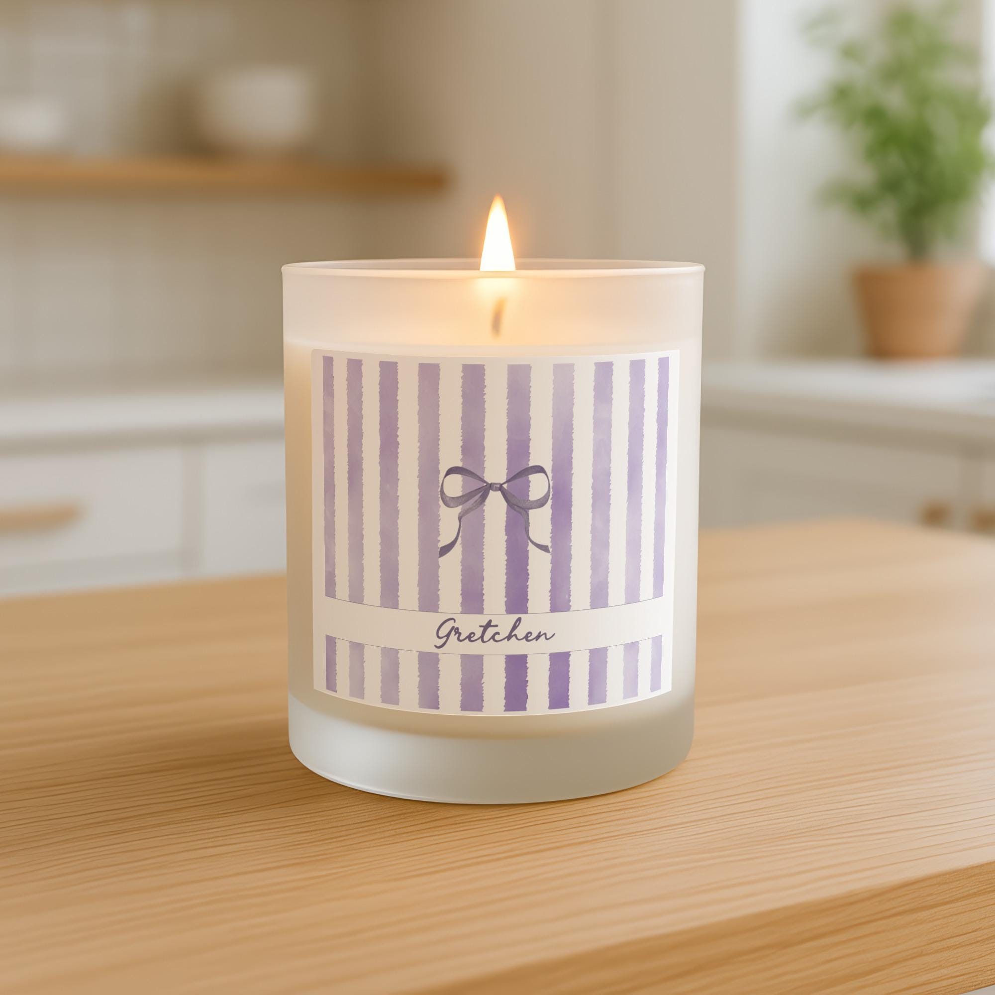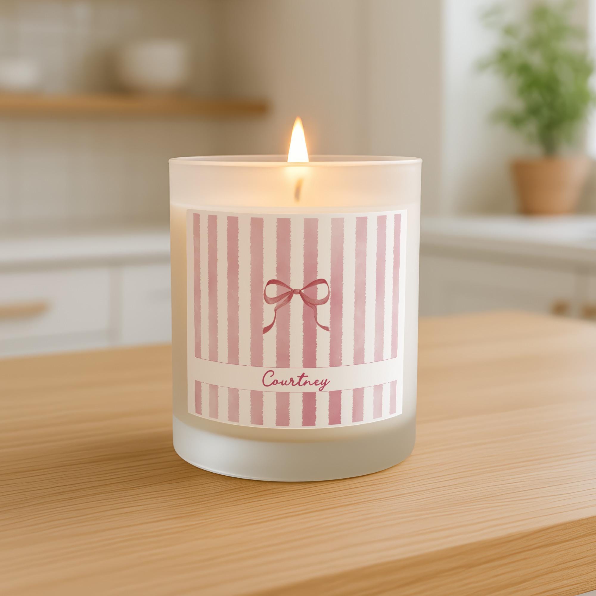 Delight her with a personalized 8oz scented candle, featuring a custom name, charming bow, and chic stripes in various color options. This frosted glass candle with its coquette aesthetic adds a sweet, feminine touch to any space. It's an ideal thank you, birthday, or appreciation gift for bridesmaids, teachers, nurses, friends, and anyone special. Make memories with this unique, thoughtful present.