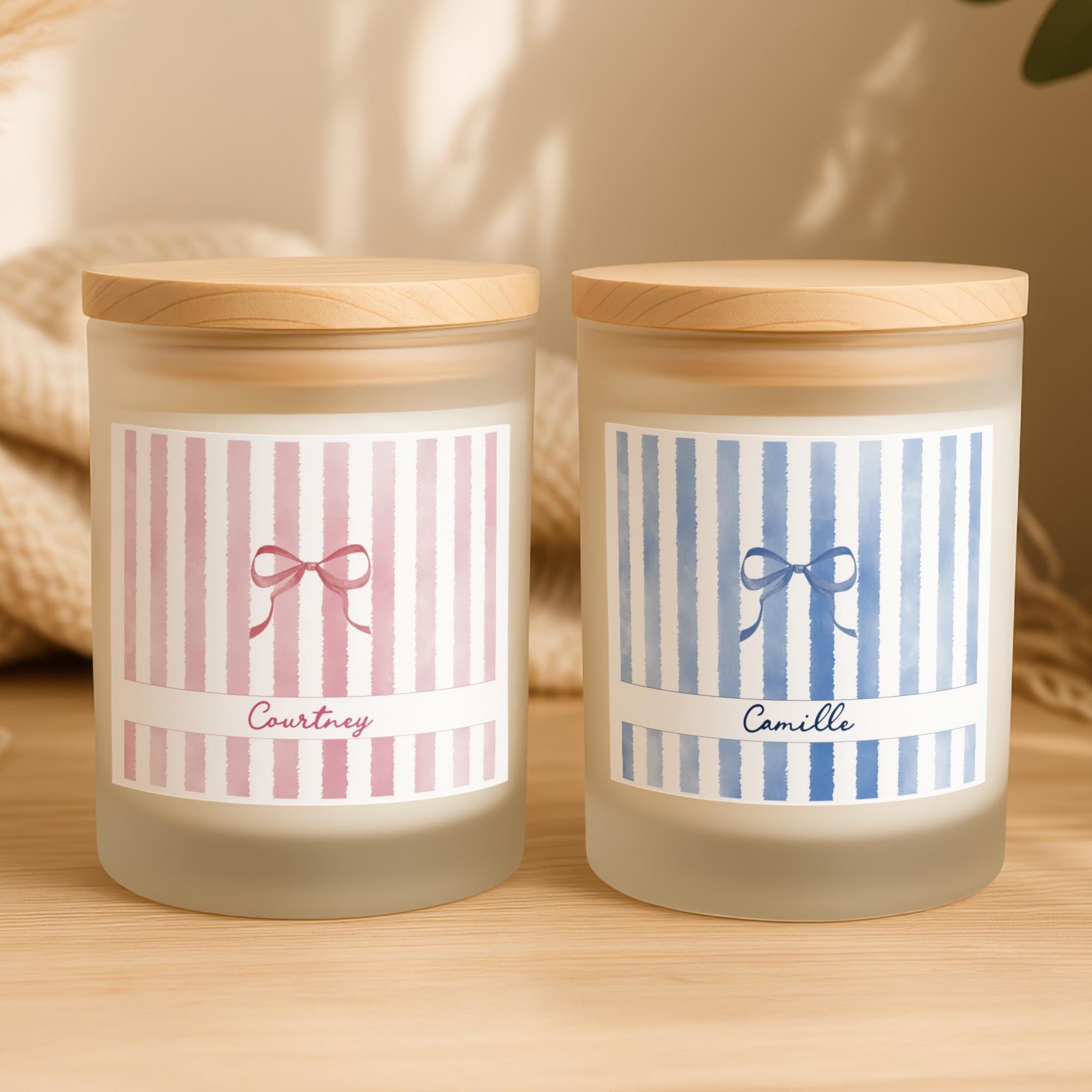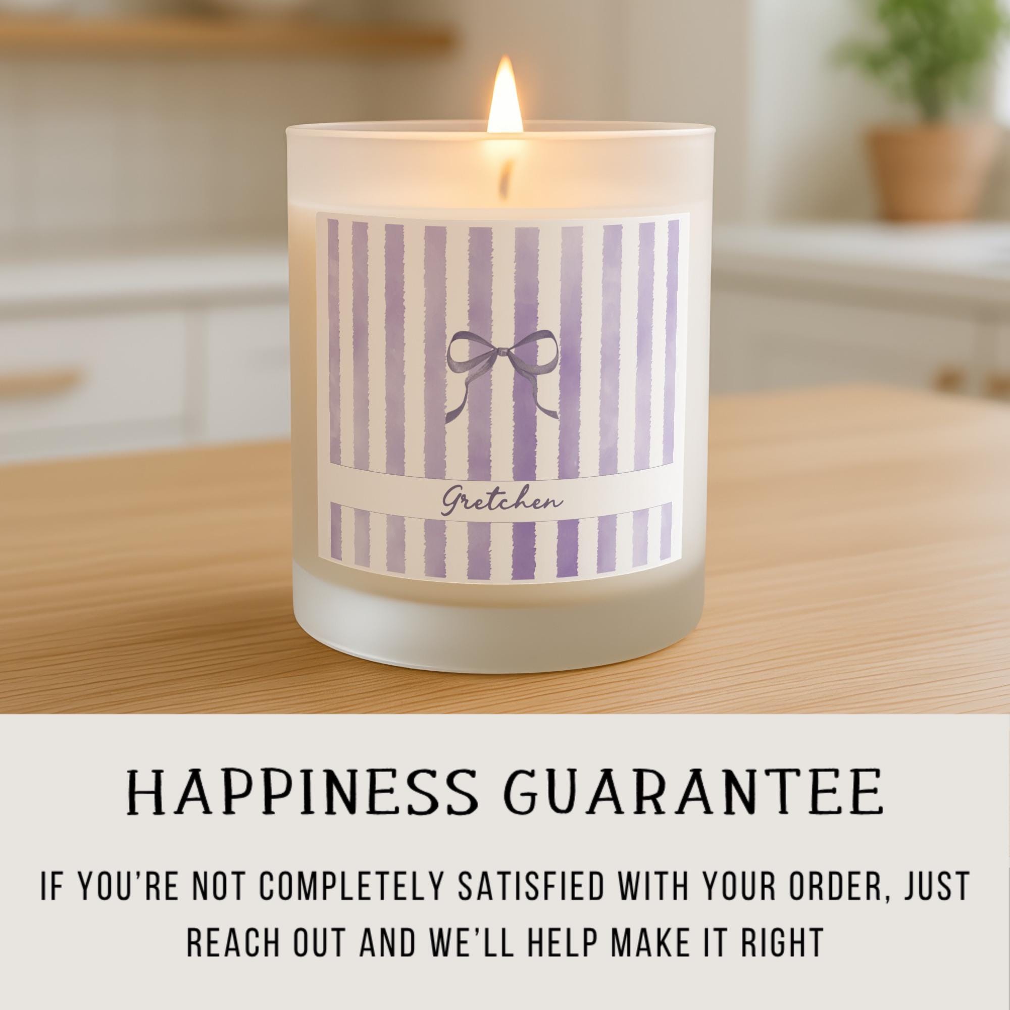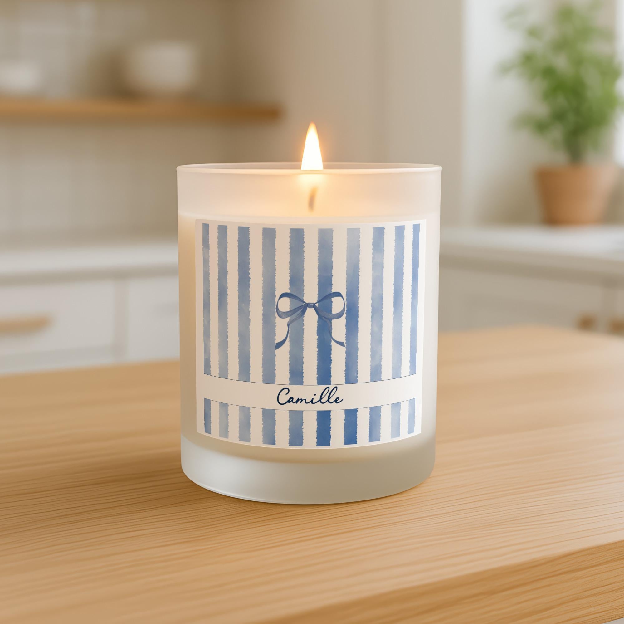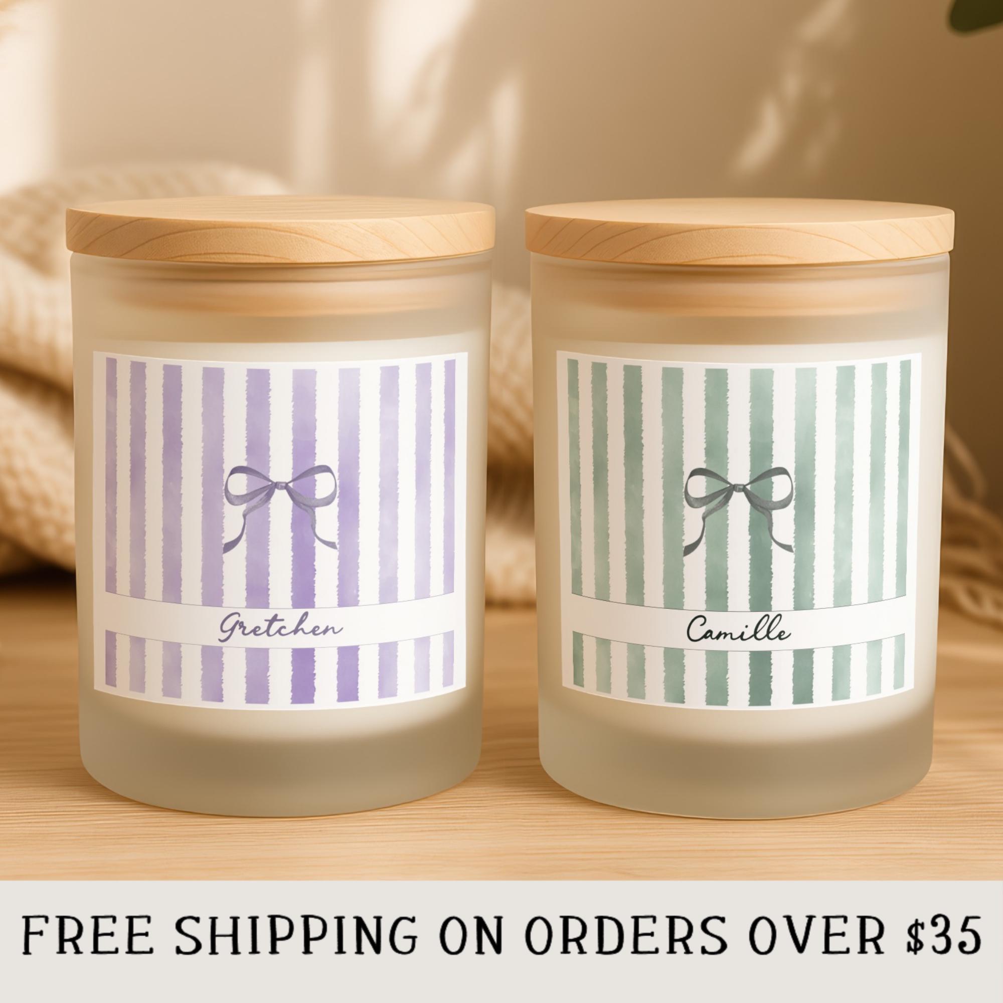Delight her with a personalized 8oz scented candle, featuring a custom name, charming bow, and chic stripes in various color options. This frosted glass candle with its coquette aesthetic adds a sweet, feminine touch to any space. It's an ideal thank you, birthday, or appreciation gift for bridesmaids, teachers, nurses, friends, and anyone special. Make memories with this unique, thoughtful present.